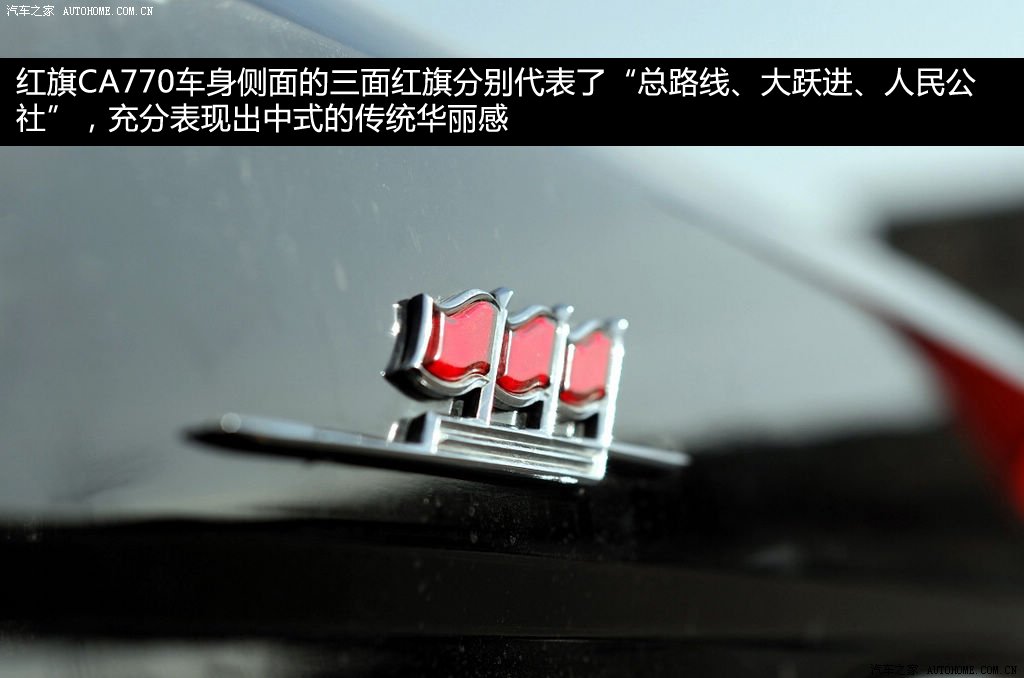 紅旗CA770整車的內(nèi)外設(shè)計均滲透了濃濃的中國特色。CA770的外形更加協(xié)調(diào)精致,突破了紅旗CA72車型“大、平、方、正”的感覺,直立式的尾燈內(nèi)包含了古代宮燈的造型,車身側(cè)面的三面紅旗代表了“總路線、大躍進、人民公社”,充分表現(xiàn)出中式的傳統(tǒng)華麗感。CA770長為5980mm,軸距達(dá)到了3720mm,即使在今天看來也絕對稱得上是個龐然大物。