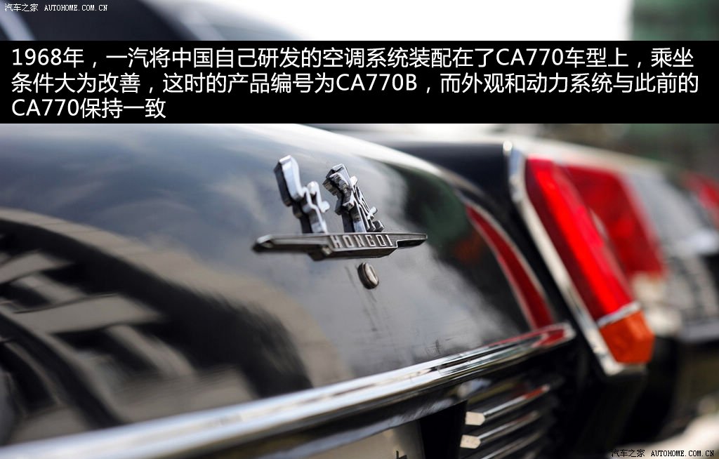 CA770定型后,經(jīng)過道路試驗沒有發(fā)生重大問題,并且各項指標(biāo)優(yōu)于CA72,達(dá)到了預(yù)期的目標(biāo),但當(dāng)時的CA770與同時代的進口高級轎車相比還存在很多不足,例如,沒有空調(diào),照明系統(tǒng)弱等。1968年,CA770投產(chǎn)三年后,中國將自己研發(fā)的空調(diào)系統(tǒng)裝配在了CA770車型上,乘坐條件大為改善,這時的產(chǎn)品編號為CA770B。