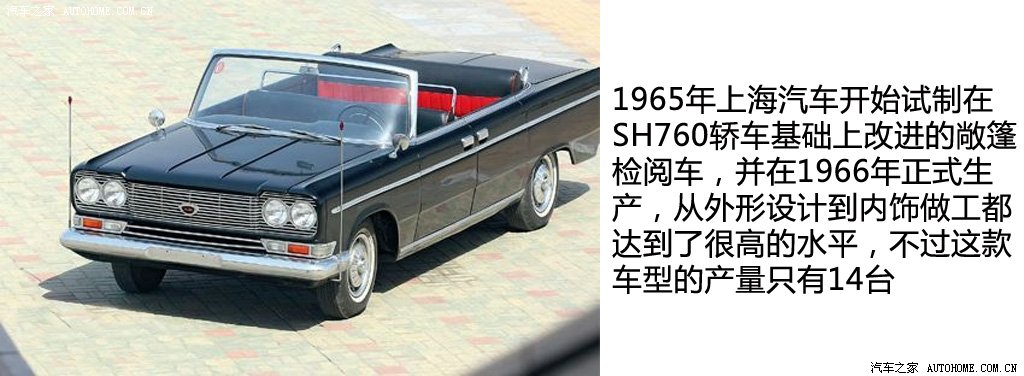 在第一臺上海SH760誕生以后,1965年上海汽車開始試制在SH760轎車基礎(chǔ)上改進的敞篷檢閱車,并在1966年正式生產(chǎn),這款車型從外形設(shè)計到內(nèi)飾做工都達(dá)到了很高的水平。無奈此時文化大革命爆發(fā),幾乎斷送了它的生命,到1971年停產(chǎn)時總共只生產(chǎn)了14輛,也沒有真正廣泛的投入到檢閱等活動中去。可以說,上海檢閱車代表了當(dāng)時上海汽車制造的最高水平,但是因為政治因素的影響,它的生命周期還沒有正式開始就結(jié)束了。