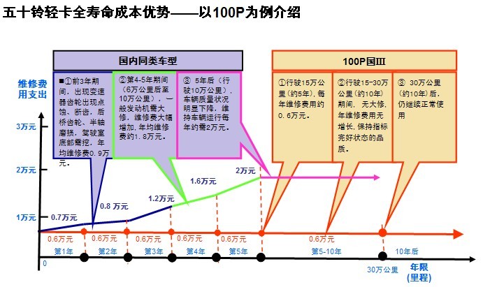 購車成本與國內(nèi)同類車型基本相當(dāng),但油耗和維修費(fèi)等使用成本低,車輛殘值較國內(nèi)同類車型高,按6~7年行駛100萬公里測算,五十鈴重卡殘值不低于8萬元。國內(nèi)同類車型雖購車成本較低,但油耗和維修費(fèi)等使用成本高,且基本無車輛殘值。