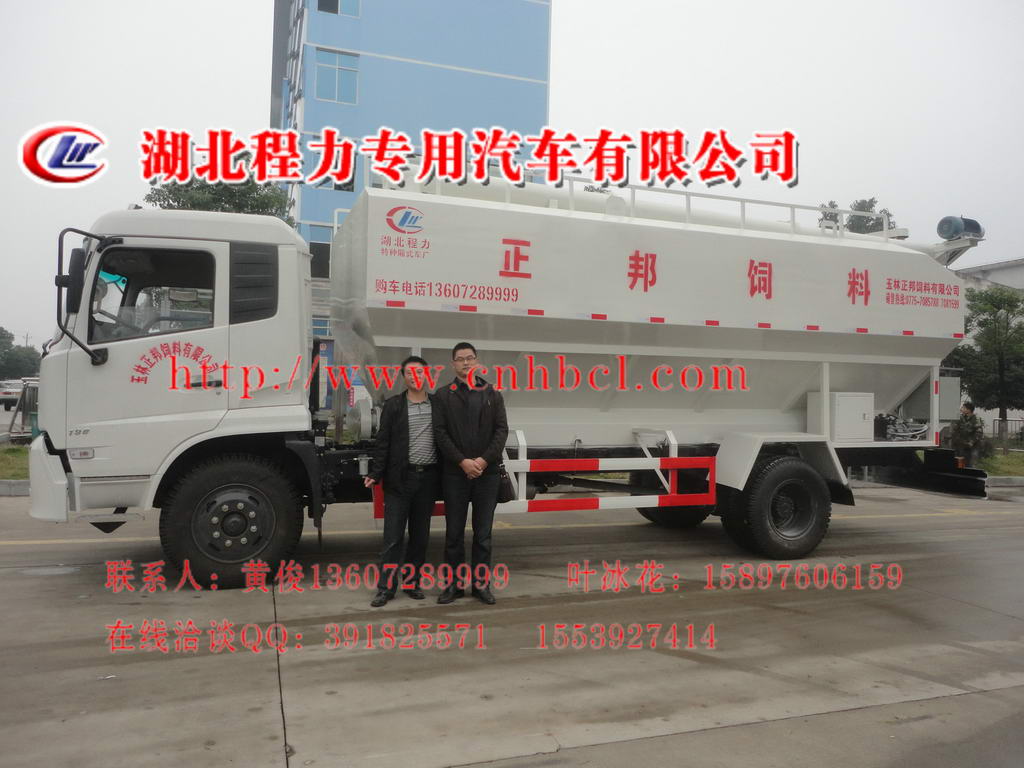 散裝飼料車的飼料罐架設(shè)在卡車的底盤上,專用設(shè)施由罐體總成、輸送系統(tǒng)(水平卸料系統(tǒng)、垂直卸料系統(tǒng)以及活動(dòng)卸料系統(tǒng)組成)、液壓系統(tǒng)(高壓油泵經(jīng)管路與分配閥連接該閥的三個(gè)輸出端分別是轉(zhuǎn)角液壓馬達(dá)、升降油缸以及串聯(lián)在一起的水平卸料、垂直卸料、活動(dòng)卸料液壓馬達(dá))、電動(dòng)系統(tǒng)、氣動(dòng)分倉(cāng)機(jī)構(gòu)等組成。在罐體底部設(shè)有閘門,在閘門下面裝有水平螺旋輸送器(俗稱水平攪籠),由取力器由汽車變速箱輸出動(dòng)力驅(qū)動(dòng),再傳動(dòng)高壓油泵以驅(qū)動(dòng)液壓系統(tǒng),液壓馬達(dá)通過(guò)傳動(dòng)裝置帶動(dòng)水平螺旋輸送器的葉片軸及葉片旋轉(zhuǎn),經(jīng)活動(dòng)輸送系統(tǒng)(俗稱活動(dòng)攪籠)以將飼料輸出。車頂平置的一根活動(dòng)卸料絞龍可自由回轉(zhuǎn)和抬升,運(yùn)輸時(shí)頂部的螺旋管平臥在罐頂;卸料時(shí)則抬起,使管端的出料口與畜禽飼養(yǎng)場(chǎng)貯料罐頂部的進(jìn)料門相接、對(duì)準(zhǔn),完成卸料。
