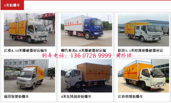 一類易燃易爆危險品車:運輸介質(zhì):黑火藥,壓縮黑火藥,電引爆雷管,爆破炸藥,點燃導火索,硝胺炸藥;運輸爆炸品的項號:1.1D,1.1D,1.1B,1.1D,1.4G,1.1D