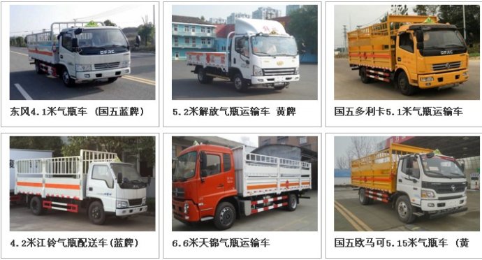 二類氣瓶運輸車:運輸具有獨立罐(瓶)容器包裝的易燃氣體:液化石油氣,壓縮天然氣,乙炔,乙烷,丁烷,丁烯,丙烯.二甲醚,壓縮氫.類項號2.1,運輸具有獨立容器包裝的非易燃無毒氣體:二氧化碳,壓縮氧.壓縮空氣(氮,氦,氬,氖),類項號2.2。