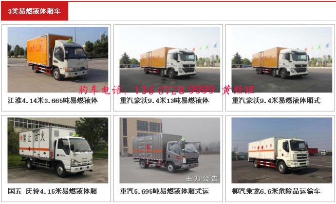 三類易燃液體箱式車:該車主要用于運輸獨立容器包裝的介質(zhì):粘合劑,涂料,料溶液,酒精,柴油,汽油,油漆,煤油,機油,苯,甲醇,乙醇,甲醇,丙酮,甲苯,二甲苯.運送危險貨物類項號為:3。