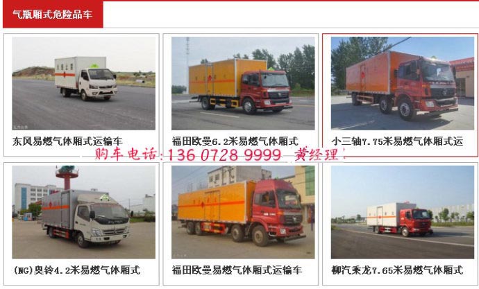 二類易燃氣體箱式車:該車運輸具有獨立容器(瓶)包裝的易燃氣體:液化石油氣、壓縮天然氣、乙炔、乙烷、丙烷、丁烷、異丁烷、丁烯、甲烷、丙烯、環(huán)丁烷、丙二烯、甲乙醚、打火機或打火機加油器(裝有易燃氣體)、氫。運送危險品類項號為2.1。